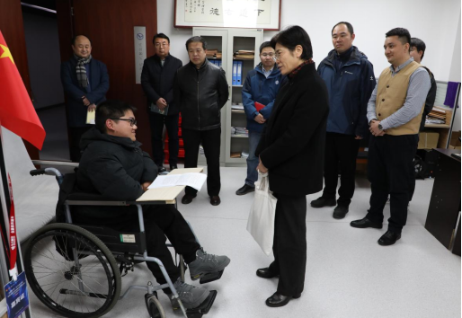 黄晓玫书记走进学院学生工作办公室,见到正在跟辅导员交流挑战杯赛事进度的周俊章同学,亲切问候他的学习、生活近况,关心他是否存在困难,未来有何发展规划等。听到周俊章同学克服万难保持学习成绩在专业第一名,获得了社会类奖学金,还参加了各类竞赛和校园文化活动,毕业有升学读研的想法,未来更好服务残疾人事业的梦想,黄书记表示感到高兴,她对学院的培养指导表示肯定,并勉励周俊章继续努力、实现梦想!