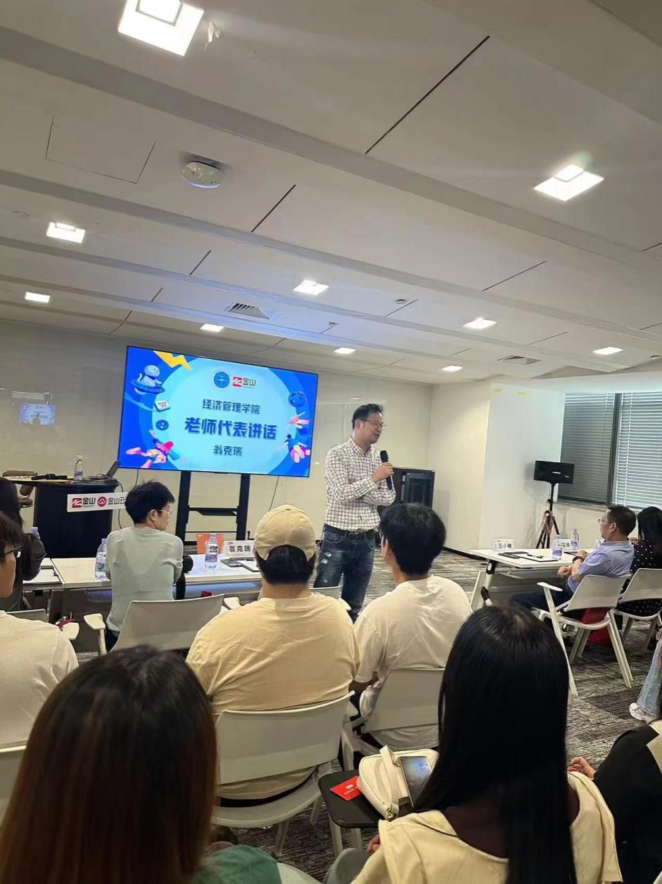管理科学与工程系副教授翁克瑞老师讲话。他向精心组织本次参访活动的集团员工表示感谢,也鼓励到场学生抓住学校学院提供的宝贵实习机会,在实践中锤炼真本领,为今后走入工作岗位打下坚实基础。