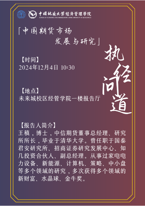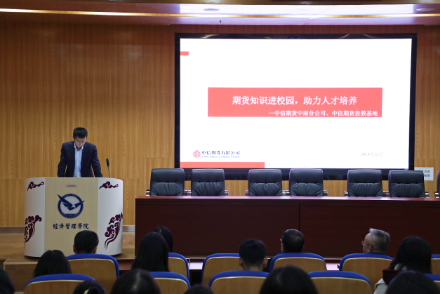 随后,由中信期货董事总经理、研究所所长、王稹博士为与会人员和相关专业学生共计60余人做了一场题为“中国期货市场发展与研究”的学术报告。