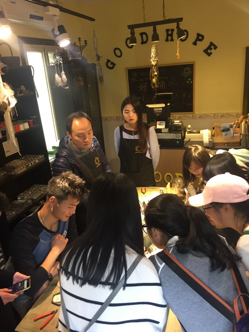 休整过后,师生一起前往位于武汉植物园附近的“大李文创村”,考察这一近几年才出现的文创艺术村的发育情况。在老师的带领下,学生们三俩结队观察并用相机记录村内外环境和设施,以游客身份参观文创作坊和民宿、试探文创产品价格、了解市场发育情况,以调查者身份访谈偶遇游客的动机和信息来源。粗略地一圈走下来,师生对该村作为城市文化创意空间的雏形案例形象及其价值就有了直观体认,一些同学还尝试用课堂中所学的理论和案例,分析和思考“大李文创村”的发展进路和对策,小专家的样子呼之欲出。