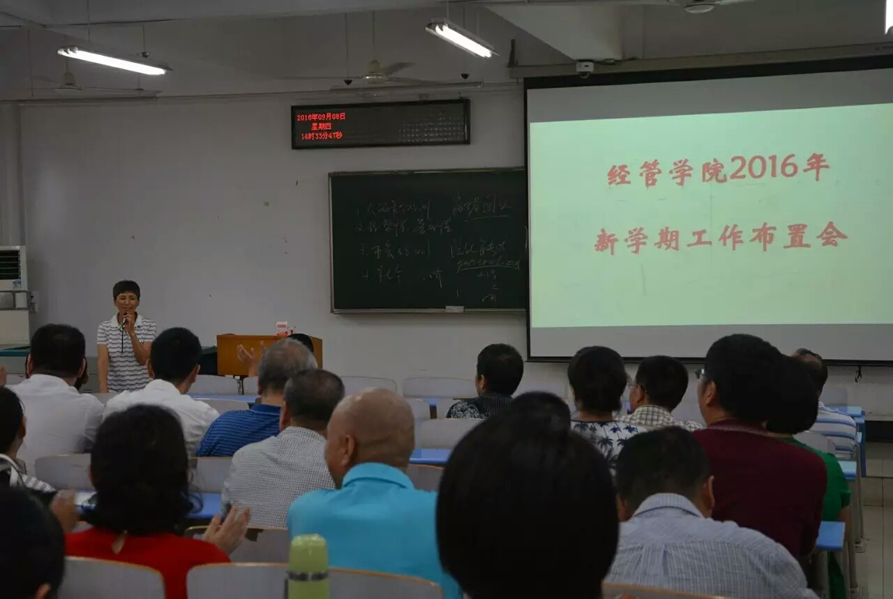 2016年9月8号下午2:30,经管学院于北综202召开2016新学期工作布置会。这次会议由经管学院党委书记隋红书记主持,学院全体教职工参加。会议首先介绍了暑假期间到岗的院党委副书记沈波老师和今年新入职的教员。