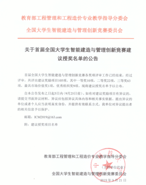 (通讯员:宫培松)由教育部工程管理和工程造价专业教学指导分委员会主办的首届全国大学生智慧建造与管理创新大赛决赛于9月14日、15日在东南大学顺利举行。本届大赛主题为“智慧工地与可持续建造管理”,有来自全国200多所高校的代表队参加初赛,最终有103支代表队进入全国总决赛。