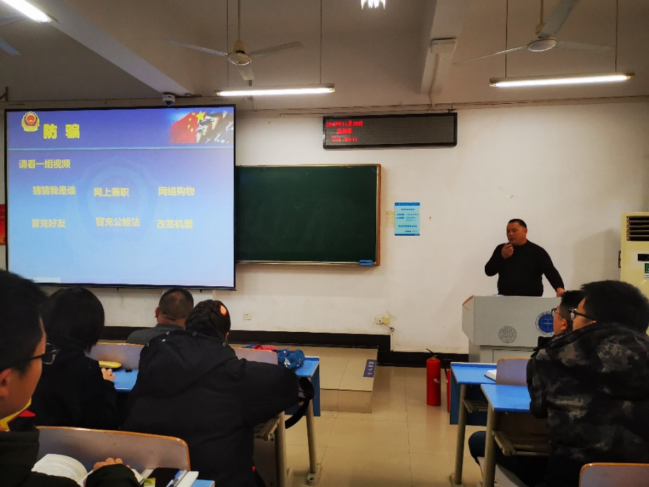 保卫处副处长单红峰作题为《大学生安全警示教育》的宣讲。他从防盗和防骗两个方面出发,提醒同学们应该提高防范意识,避免被盗与被骗情况发生。单处长的语言风趣幽默,用身边的案例说明问题,同学们表现积极,现场气氛融洽。