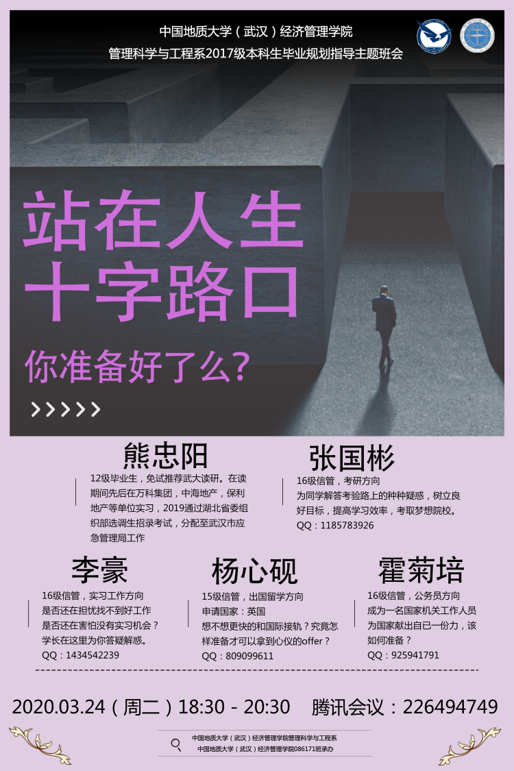 为帮助2017级本科生尽早确定毕业规划,做好学业规划,3月24日晚,管理科学与工程系召开2017级本科生线上毕业规划指导会。会议由管科系系主任、086171班班主任王广民老师设计与组织,管科系支部书记、089171班班主任孙涵老师,089172班班主任柯小玲老师,086172班班主任李龙锡老师,管科系辅导员徐媛老师以及管科系2017级110位学生参加了会议。管科系五位优秀学子熊忠阳、张国彬、李豪、杨心砚、霍菊培受邀参加。会议由086171班班长张冰主持。