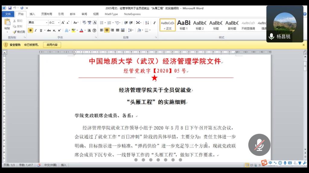 (通讯员:陈艳)2020年5月11日下午14:30,经济学系在线召开了“2020届毕业生毕业就业双促会”。经管学院党委书记杨昌锐、副书记沈波、就业指导老师田昆、经济系全体教师参加了本次会议。会议由经济系支部书记齐睿老师主持。