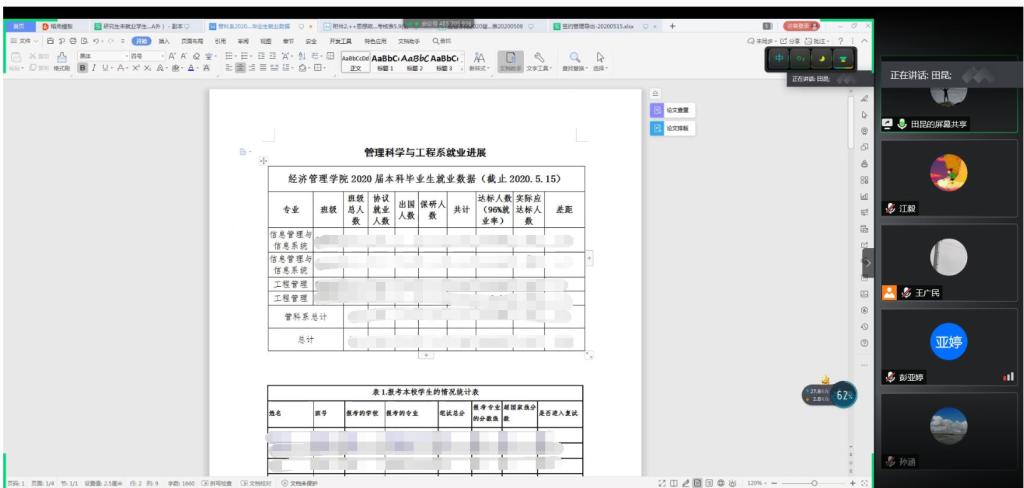 针对应届生就业工作,辅导员田昆老师对管理科学与工程系2020届本研毕业生就业情况进行了详细介绍,并指出当前存在的问题,同时对老师提出的就业政策疑问进行了解答。此外,四个本科生班级的班主任老师也结合各自班上的就业情况和系里各位老师进行了讨论,明确了下一阶段促进不同类型学生就业的针对性方案。