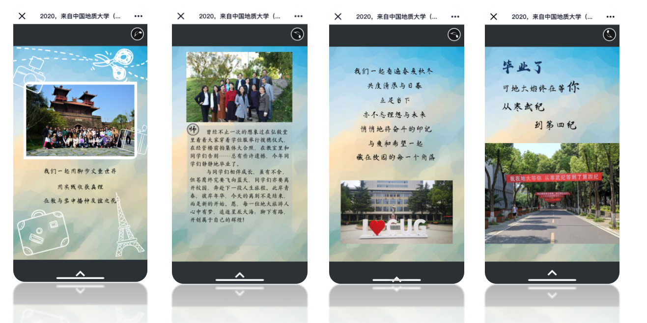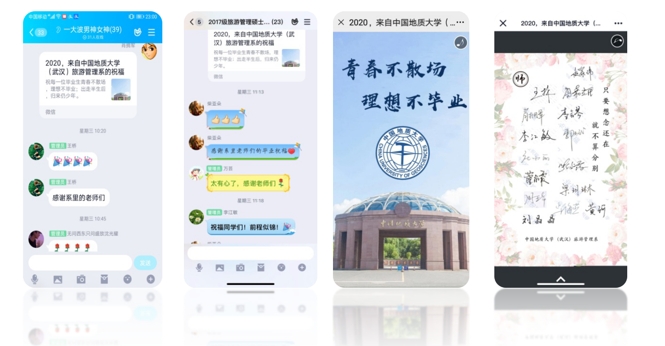 6月24日,第一批返校首日,当陆续落地武汉的学子踏上学校迎接毕业生返校的专车时,旅游管理系085161班同学和2017级硕士生在各自的QQ群里收到一条消息。点开时,同学们收到了由全系老师们精心准备并签名的电子毕业祝福卡——《青春不散场,梦想不毕业》。淡淡的伤感和深深的留恋随着The Simpler Time的BGM流淌,一帧帧照片,是满满的回忆,记录着同学们成长的足迹,一字字祝福,是殷殷的深情,表达着老师们放飞的不舍。