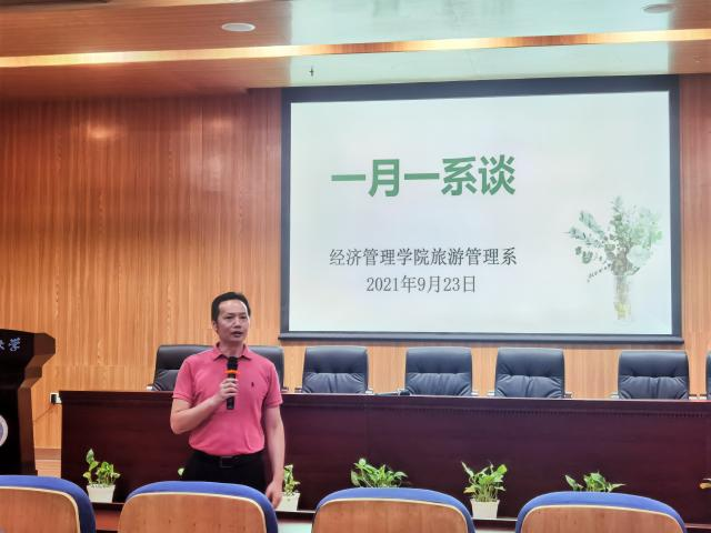 9月23日下午2点,旅游管理系在未来城校区色色 一楼报告厅举行了“一月一系谈”活动暨085191班的暑期北戴河旅游教学实习总结会。本次活动到场人员有旅游管理系肖拥军主任、李会琴老师、黄珂老师、辅导员赵家玮及085191班全体同学。