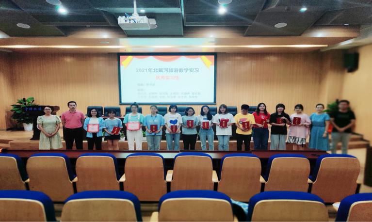 第二环节是北戴河旅游教学实习总结会。暑期北戴河实习队队长李会琴老师总结了于8月15日至29日进行的北戴河旅游教学实习。她指出本次实习突出了三个特点:一是创新性,为了疫情防控需要,本次实习首次采用线上方式,经过教师们的辛勤备课和努力,圆满的完成了五条教学线路的教学;其次是认真,同学们在家克服种种困难,每天坚持线上学习,认真记录,充分利用信息时代教学特点,积极查阅资料,对实习教学内容掌握的牢固熟练;第三是团结,通过小组作业展示,每组同学都表现出了团队协作的精神,对所负责线路的讲解,各自发挥所长,分工协作,交上了一份份精彩的展示。本次北戴河旅游教学在老师和同学们的共同努力下克服艰难险阻圆满完成。随后,对北戴河旅游教学实习优秀实习生进行表彰。陈可舒等13名同学被评为“优秀实习生”。老师们为获奖学生颁发荣誉证书,并勉励大家继续努力,争取更好的成绩。