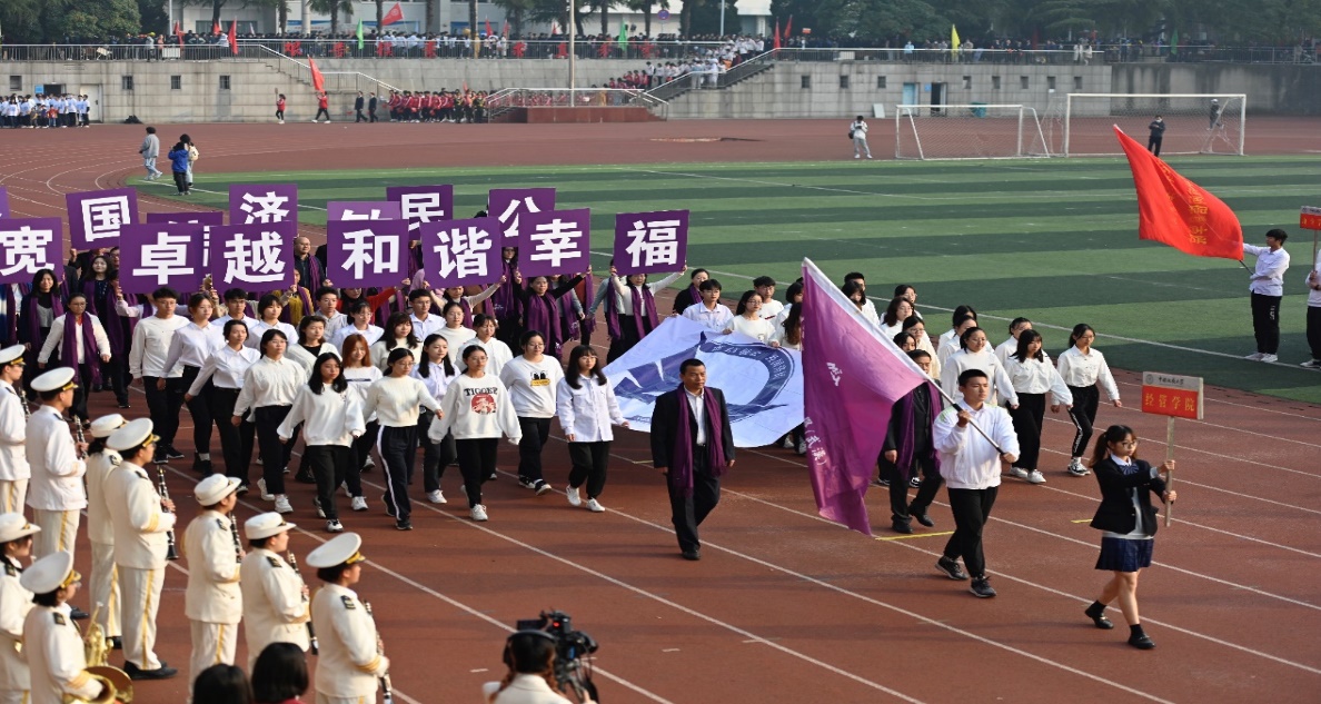 在10月29日的开幕式上,在书记和院长的带领下,由色色 师生组成的色色 方阵步伐稳健,昂首阔步走过主席台,亮相全校师生。“卓越、和谐、幸福”的院风,凝聚人心;“宽信敏公,经国济民,地大精鹰,长空万里”的口号,铿锵有力,响彻南望山,展现了经管人的家国情怀。