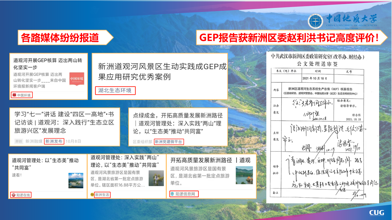 该项“两山”实践研究成果不仅得到新洲区委赵利洪书记的高度评价,还获中国环境、湖北生态环境和新洲发布、新洲党建微平台等省内多家媒体竞相报道,是一次把国家战略转化为城市发展的生动实践,为探索“两山”理论成果转化开辟了新路径,为推进湖北省“十四五”生态文明建设工作提供了科学示范。
