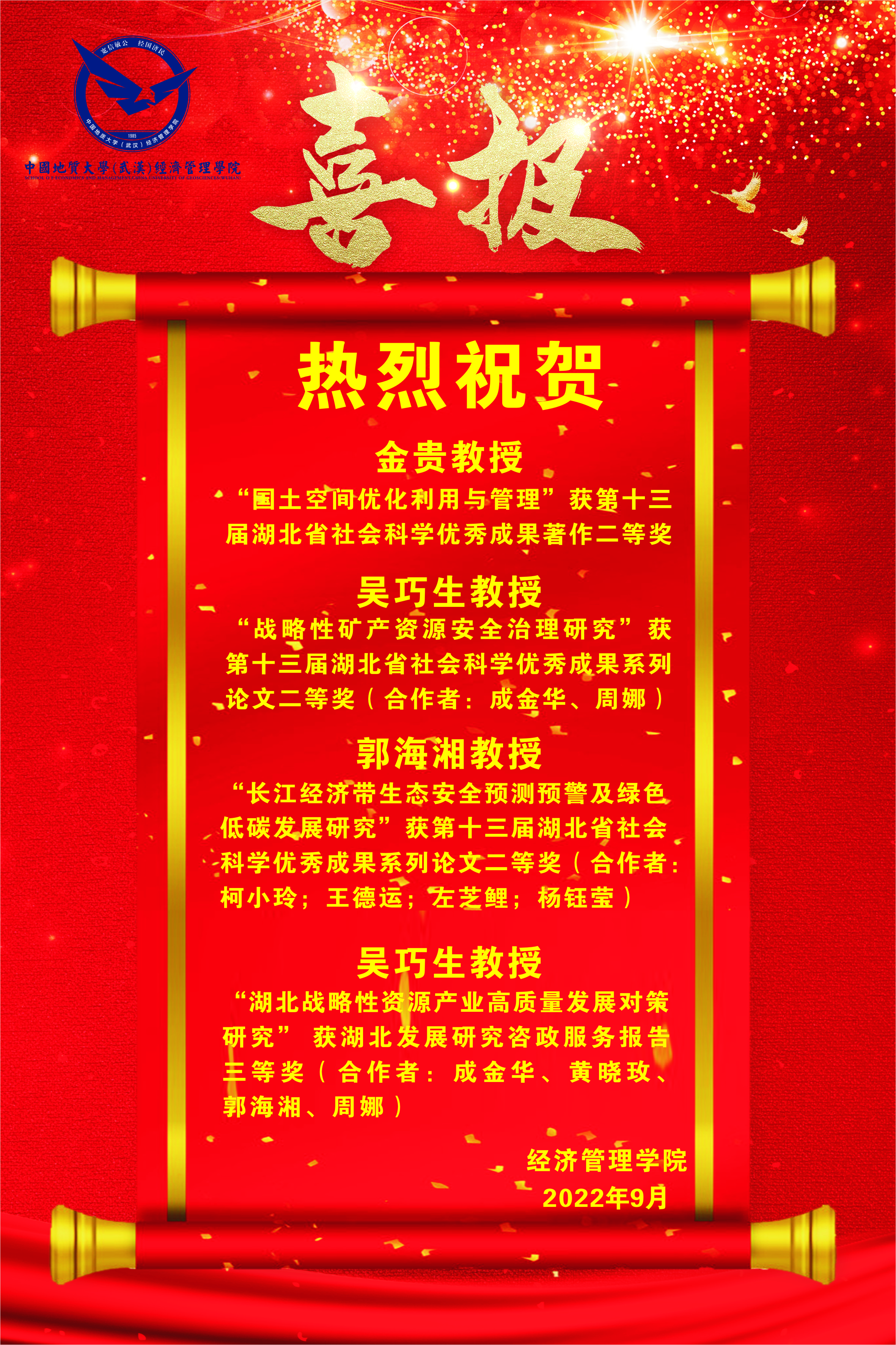 近日,第十三届湖北省社会科学优秀成果奖获奖名单和湖北省发展研究奖(2020—2021年)获奖名单公布,学校共获得一等奖1项,二等奖4项,三等奖5项。其中,色色 吴巧生教授、金贵教授、郭海湘教授分别获第十三届湖北省社会科学优秀成果二等奖,吴巧生教授获湖北发展研究三等奖。