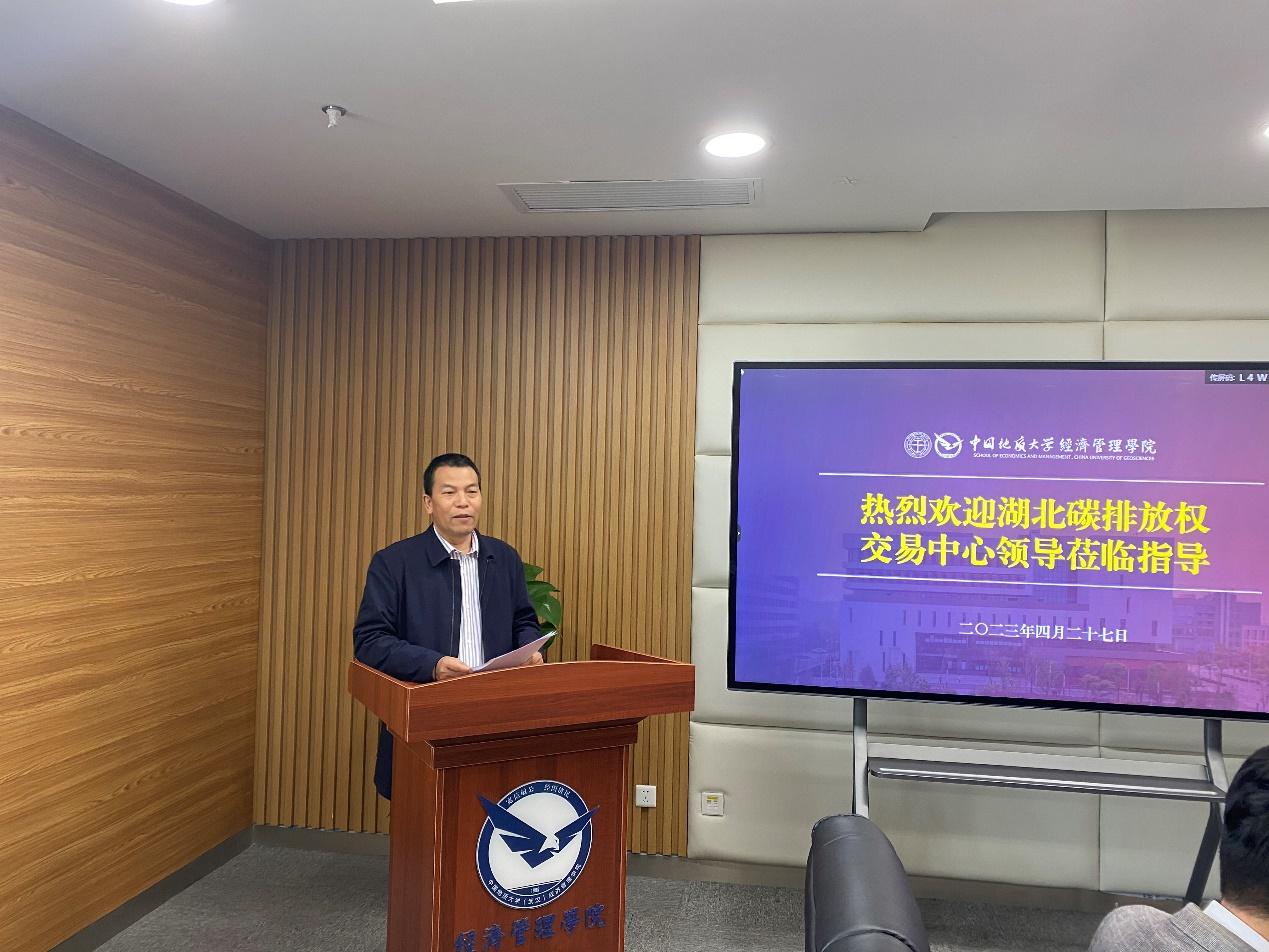 杨树旺代表学院致欢迎辞,并对基地的揭幕表示祝贺。杨树旺表示,碳中和人才就业工程实训基地是校企合作共建的专业碳人才就业平台,学院将与湖北碳交中心强强联合,在以双碳为主题的校企合作创新上共同探索,并以争取成为“全国领先的碳中和人才培训与就业平台”为目标而努力。