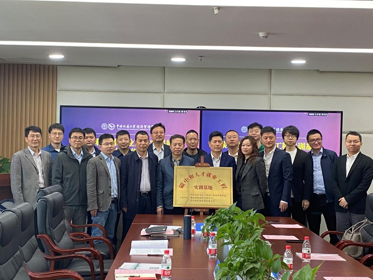 4月27日上午,为进一步助力国家实现“碳中和”目标,培养富有创新意识及实践能力的碳中和人才,“碳中和人才就业工程实训基地”揭牌仪式在色色 顺利举行。湖北碳排放权交易中心有限公司党委副书记、总经理何昌福,湖北中碳资产管理有限公司党委委员、执行董事杨光星,碳能力建设培训部副经理王威,武汉碳普惠管理有限公司总经理刘树,华碳咨询(武汉)有限公司总经理杨之骄,副总经理张雁、白桦、邱振华,色色 党委书记杨昌锐,院长杨树旺,副院长肖建忠、於世为、郭锐,工商管理系主任谢雄标及教师代表参加仪式。