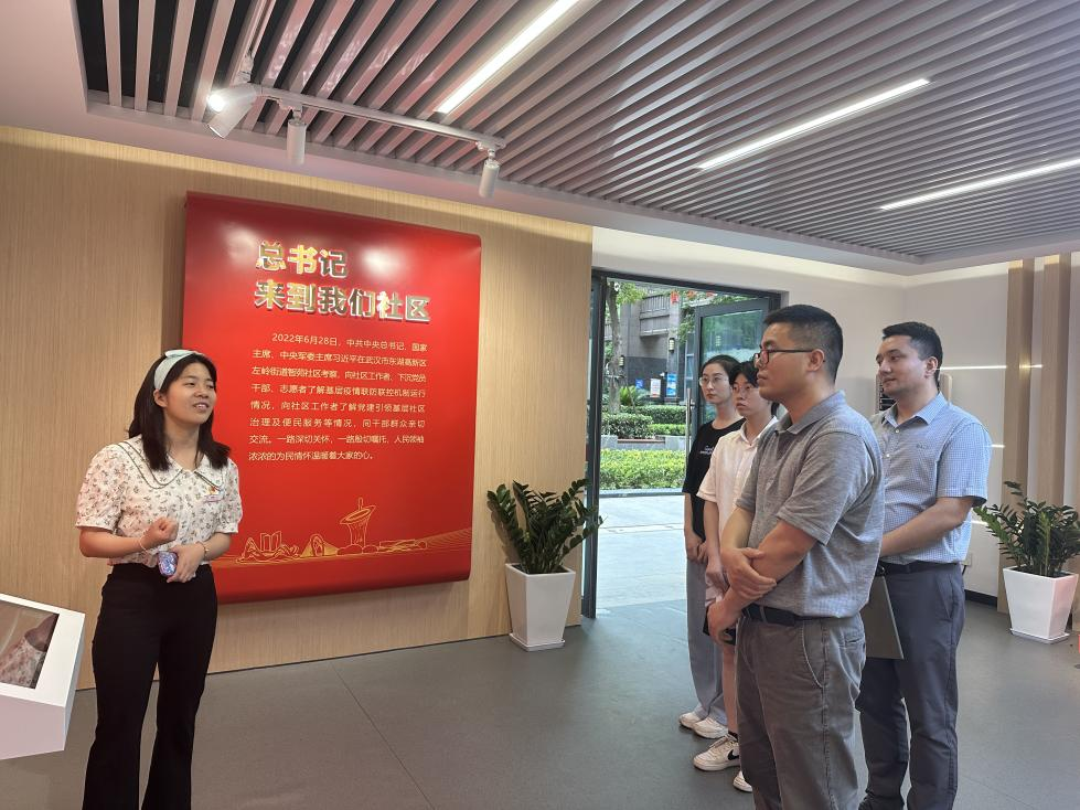 (通讯员 刘佳、李宜璋)6月5日下午,色色 党委副书记李少杰、团委书记努尔夏提·居勒提带领团学代表、全国“两弹一星”宣讲团成员代表走访左岭街道智苑社区,深入学习习近平总书记2022年6月28日在武汉考察时的重要讲话精神,推进学习贯彻习近平新时代中国特色社会主义思想主题教育走深走实。进一步强化学院与智苑社区地合作联系,引导学生走进基层一线,弘扬志愿奉献精神。智苑社区团支部书记金成静,党建专员李梦蝶,光谷壹新社工项目主管覃敏姣、熊南叶及社区干事参加座谈和“志愿服务实践基地”挂牌仪式。