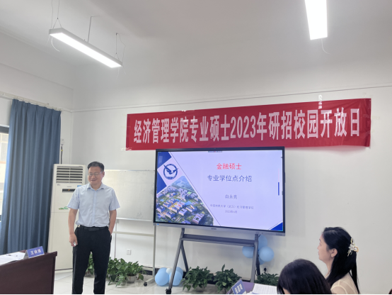 金融与贸易系白永亮老师首先向同学们介绍了金融行业对学科人才的需求,然后详细介绍了色色 金融专硕学位点的建设基础与支撑学科、培养目标与学科培养优势与特色方向。他介绍到色色 于去年和今年分别承办了2022中国绿色金融学术年会、2023气候投融资国际论坛暨丝路讲坛,为金融学科发展提供交流的平台。