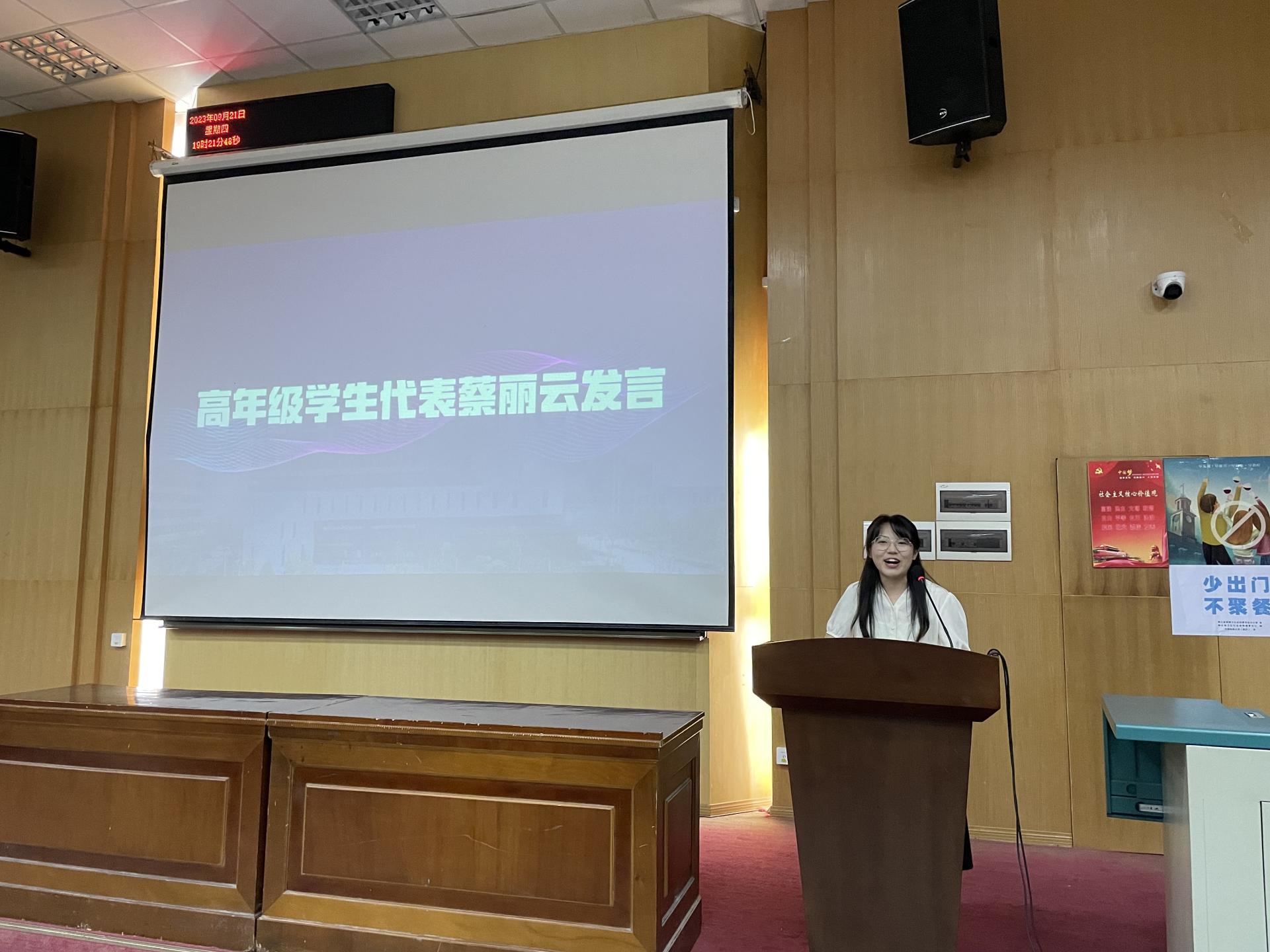 典礼第四项,高年级学生代表蔡丽云发言。蔡丽云同学将自己的大学经验向同学们分享:第一,勇于探索,拓展未知,在每一次的探索与体验中不断明确奋斗的目标;第二,以终点的心态规划起点,珍惜资源、抓住机会,为大学生涯做好规划;第三,知行合一,经世致用,以脚踏实地的努力、认真勤奋的学习、坚持不懈的磨练创造更高的人生价值、社会价值。
