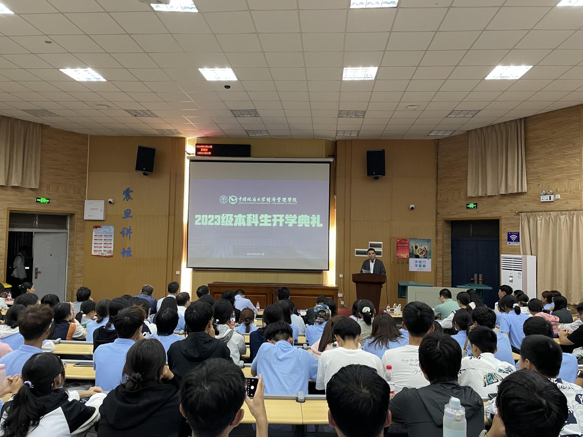 典礼第八项,院党委书记杨昌锐为全体新同学讲授开学第一课——《经管学院文化》。他从学院院训、院徽、院风、使命、愿景五个方面对学院文化进行深入解读,并与新生分享了“学习工作十观”。希望全体新生能够在良好的学院氛围下,努力拼搏进取,不断追求卓越,早日成为“品德高尚、基础厚实、专业精深、知行合一”的地大人。