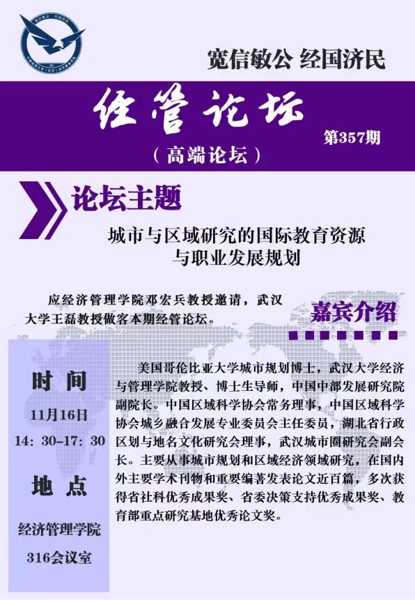 经管论坛(第357期)城市与区域研究的国际教育资源与职业发展规划