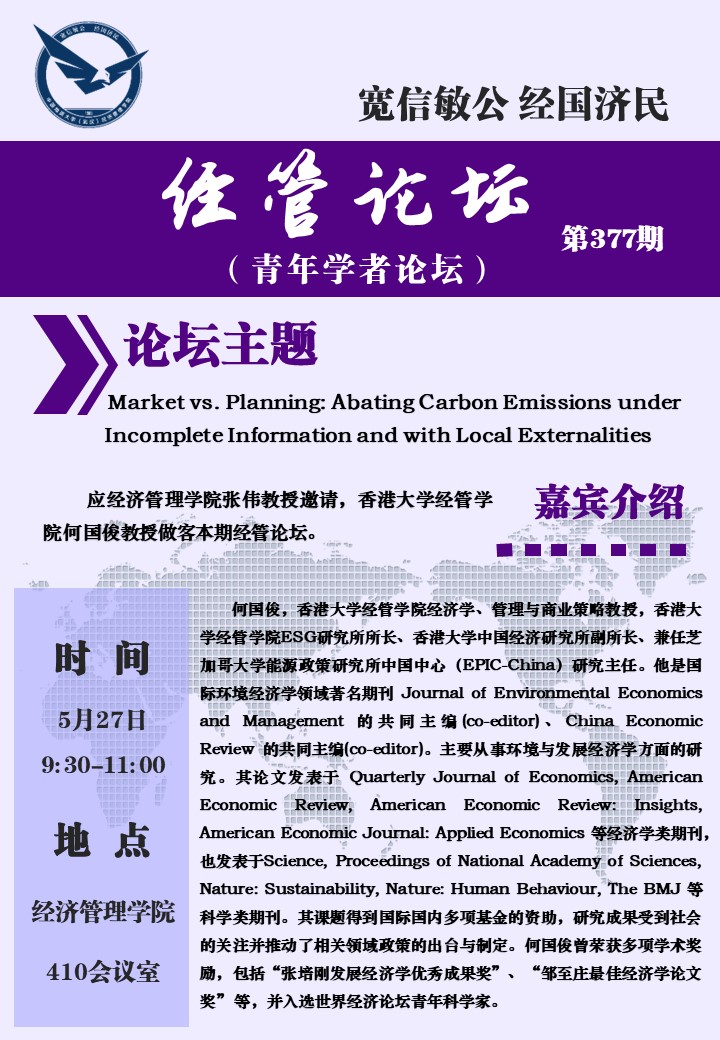 经管论坛(第377期)Market vs.Planning:Abating Carbon Emissions under Incomplete Information and with Local Externalities.