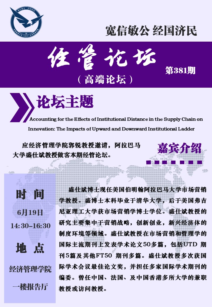 经管论坛(第381期)Accounting for the Effects of Institutional Distance in the Supply Chain on Innovation: The lmpacts of Upward and Downward Institutional Ladder.