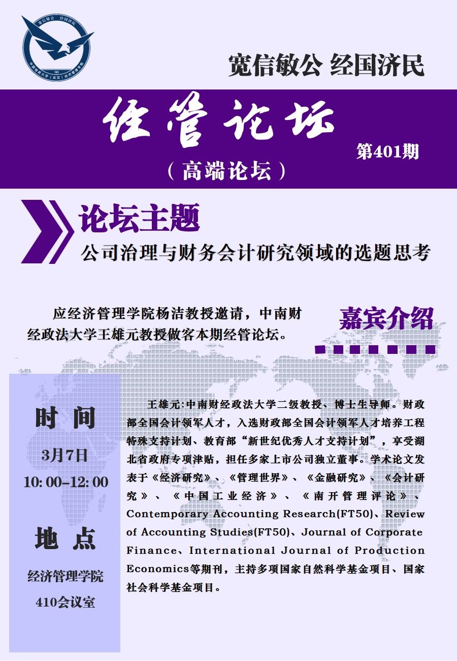 经管论坛(第401期)【高端论坛】公司治理与财务会计研究领域的选题思考
