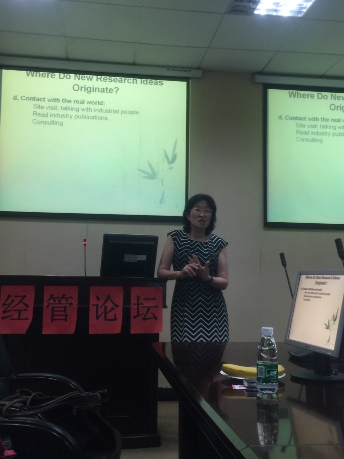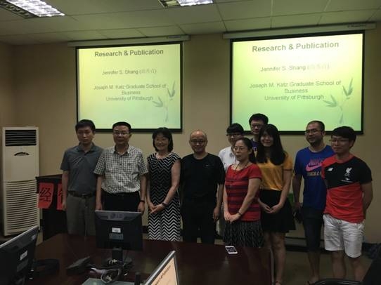 2016年7月6日,美国匹兹堡大学教授Jeniffer Shang应色色 严良院长和郭海湘教授邀请,于下午3时在MBA104与色色 各位师生进行学术交流,作了题为Reaearch&Publication的精彩报告并以问答的形式与各位师生进行了更进一步的讨论。严良院长,王开明副院长等出席会议。