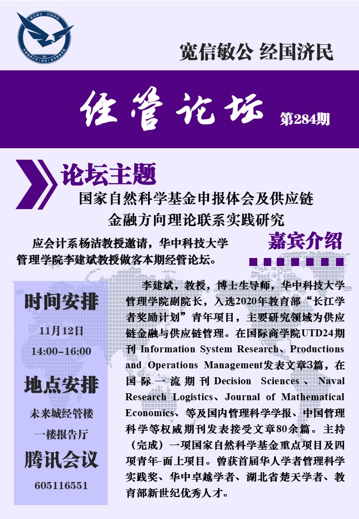 经管论坛(第284期)国家自然科学基金申报体会及供应链金融方向理论联系实践研究