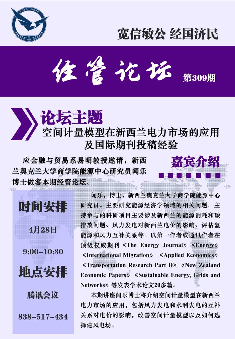 经管论坛(第309期)空间计量模型在新西兰电力市场的应用及国际期刊投稿经验