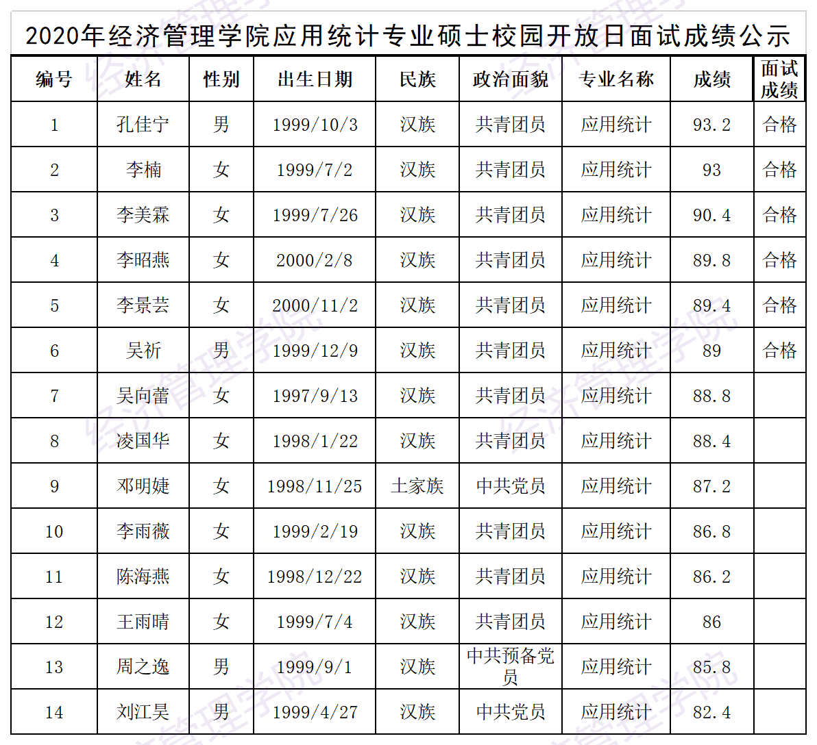 2020年色色 应用统计专业硕士校园开放日面试成绩公示