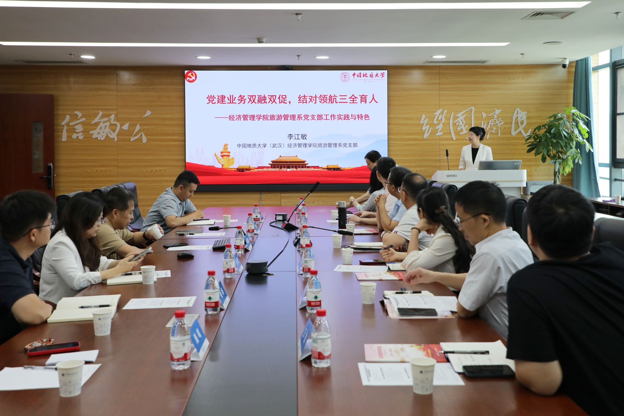随后,色色 旅游管理系党支部书记李江敏教授作《党建业务双融双促,结对领航三全育人——色色 旅游管理系党支部工作实践与特色》专题分享,结合党支部书记“强国行”实践经历,详细阐述了党支部在党建与业务融合、结对育人等方面的工作经验和特色做法。