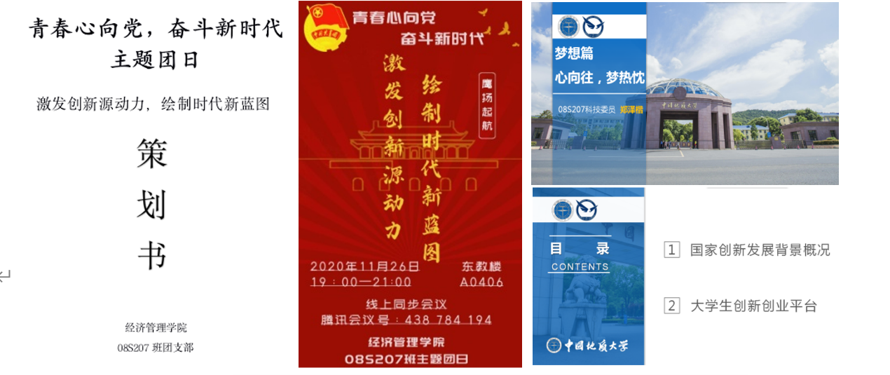 在活动策划阶段,小组成员就创新创业背景、视频素材和典型案例、地大大学生科研和创新创业实践和训练项目及其平台等广泛查找资料,并整理形成一份有关创新创业的PPT文件,存入班级QQ群文件中,供班级同学随时查阅学习。小组成员还就主题团会的流程及其组织开展向高年级085181班寻求并学习、借鉴组织主题班会的经验,相关能力在“干中学”快速获得和提升。