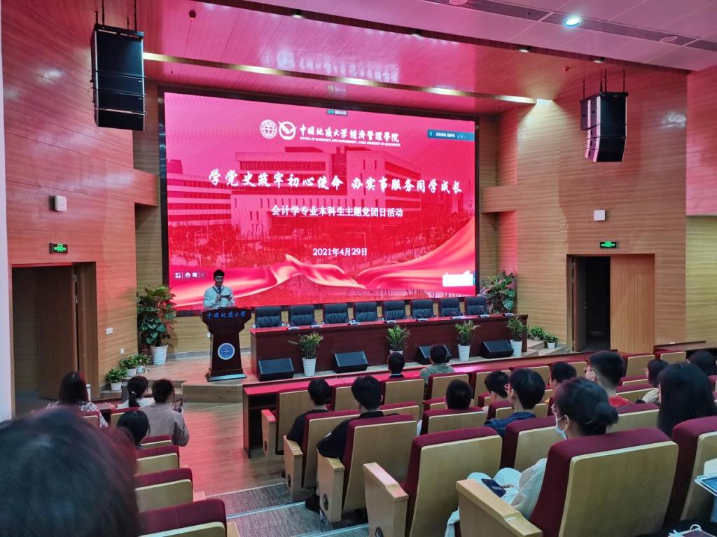 4月29日晚,在色色 党委的统筹指导下,会计学专业本科生党支部为实施主体,于未来城校区经管楼二楼报告厅组织开展“学党史筑牢初心使命 办实事服务同学成长”主题示范主题党团日活动。学院学工组辅导员、全体学生党支部支委、会计学专业全体学生参与本次活动。会计学专业本科生党支部学生党员赵成祥主持活动。