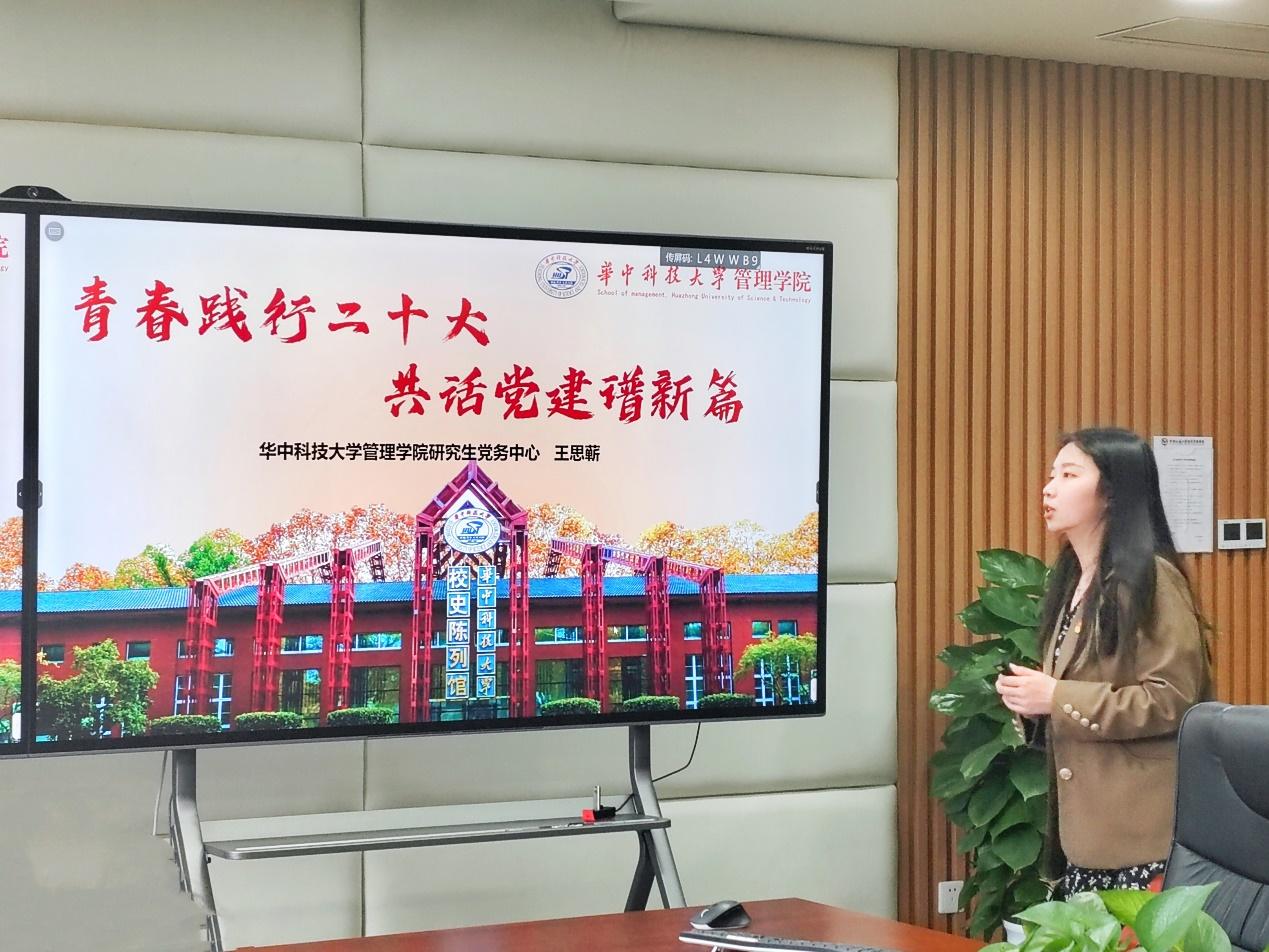 青春践行二十大,共话党建谱新篇。接下来,王思蕲介绍了华中科技大学管理学院研究生党务中心的组织逻辑和特色活动。该中心以“聚焦立德树人,创新党建模式”为理念,制定组建管理思路,结合学院支部具体建制情况,科学构建了“辅导员—党建德育助理—党务中心—支委会—学生党支部”五级责任制度和反馈机制。她指出立德树人是高校的根本任务,党建育人是高校育人重要抓手,高校党建工作要坚持以习近平新时代中国特色社会主义思想为指导,深入贯彻落实党的二十大会议精神,紧紧围绕立德树人这一核心,探索创新党建育人新模式,培养德智体美劳全面发展的社会主义建设者和接班人。