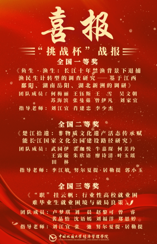 10月27日至31日,由共青团中央、中国科协、教育部、中国社会科学院、全国学联和贵州省人民政府共同主办,贵州大学承办的第十八届“挑战杯”全国大学生课外学术科技作品竞赛终审决赛在贵州大学落幕。该赛事以“崇尚科学、追求真知、勤奋学习、锐意创新、迎接挑战”为宗旨,经过30余年的发展,在广大高校乃至社会上产生了广泛良好的影响,被誉为当代大学生科技创新的“奥林匹克”盛会。据悉,本届“挑战杯”竞赛搭建主体赛、“揭榜挂帅”专项赛、红色专项活动、“黑科技”展示活动有机组成的“1+1+2”赛事整体架构,吸引到全国2000多所高校、40余万作品、250多万学生参赛。色色 共有3支团队分别入围主体赛、“揭榜挂帅”专项赛、红色专项活动三个赛道,并首次在同一届赛事中,斩获三个赛道的国家级奖项,为历史最好成绩。其中,“江研境学”团队荣获主题赛全国一等奖,“楚江拾遗”团队荣获红色专项活动二等奖,“‘职’挂云帆”团队荣获“揭榜挂帅”专项赛三等奖。