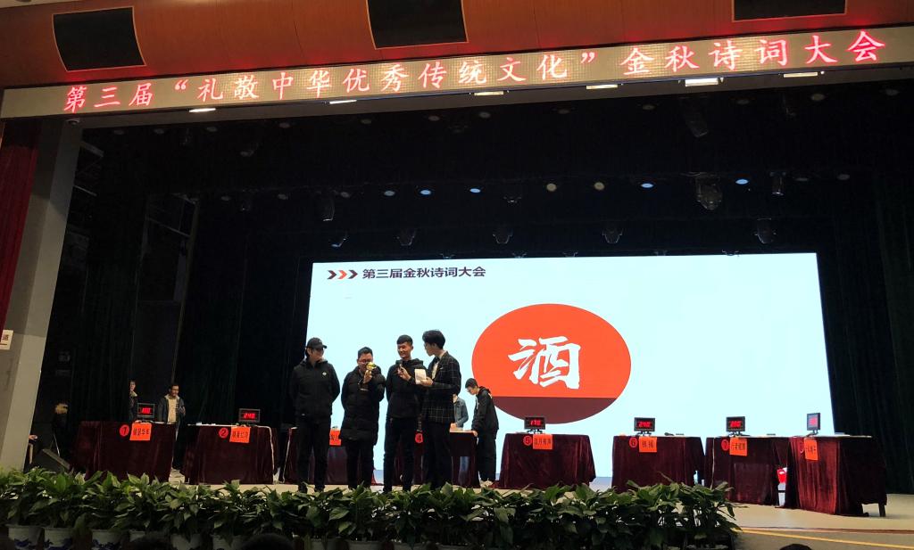 12月11日的决赛现场,色色 “浪淘沙”团队经过“江山代有才人出”环节精彩亮相,在“万紫千红总是春”环节获得累计得分第二名,而后在“歌尽桃花扇底风”环节反超成为累计得分第一名,并在接下来的“狭路相逢勇者胜”、“柳暗花明又一村”环节中保持最高分数。在“万紫千红总是春”的决胜环节,题目为“酒”字飞花令,团队成员夏益骏同学出战,以渊博的诗词储备量击败对手,代表经管学院荣获第一名的佳绩!