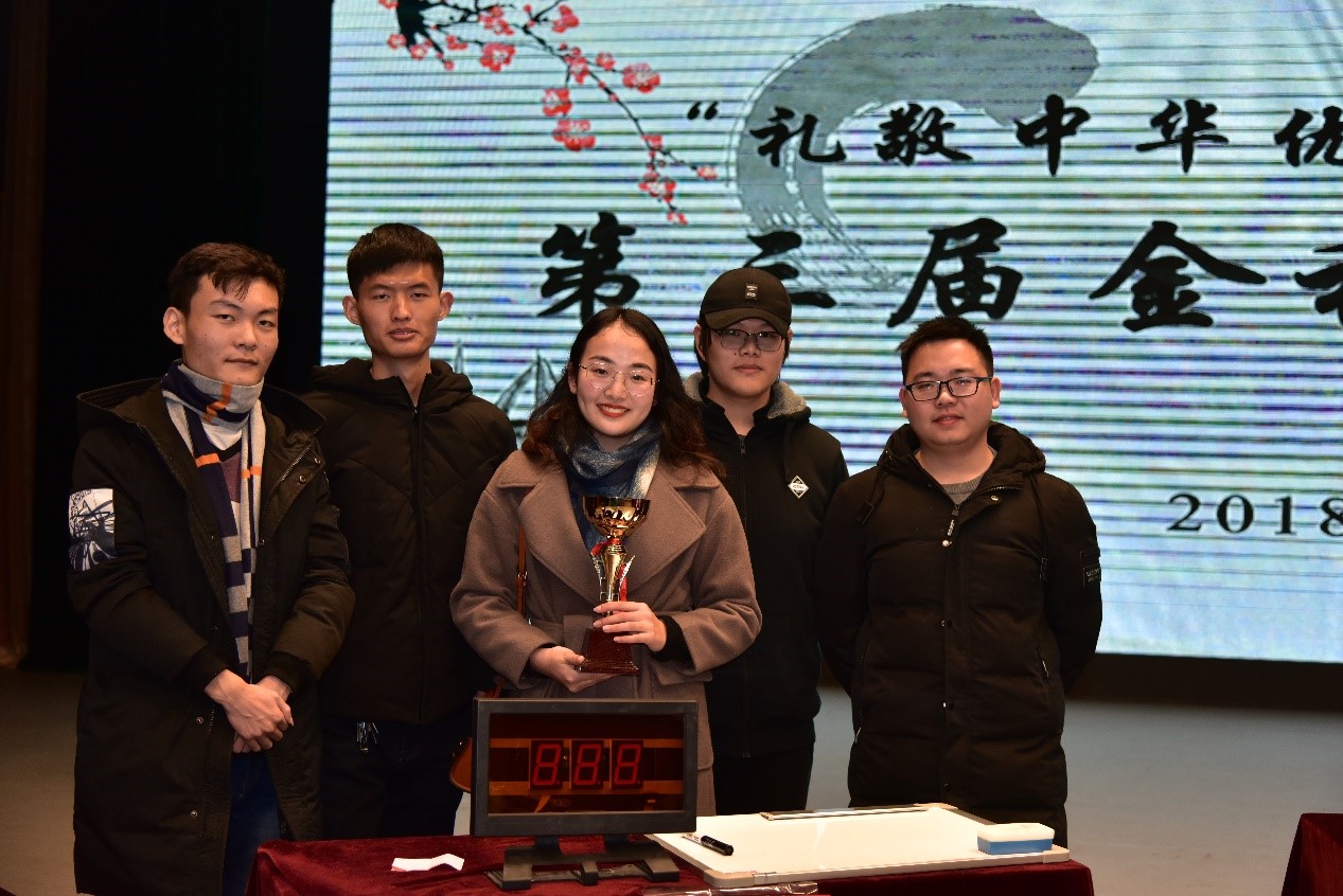 12月11日,学校第三届“礼敬中华优秀传统文化”金秋诗词大会决赛在弘毅堂举行,色色 17级资产评估专业研究生鲍雷、阴朝旭、陈习良,17级经济学专业本科生夏益骏组成的“浪淘沙”团队代表学院荣获第一名。
