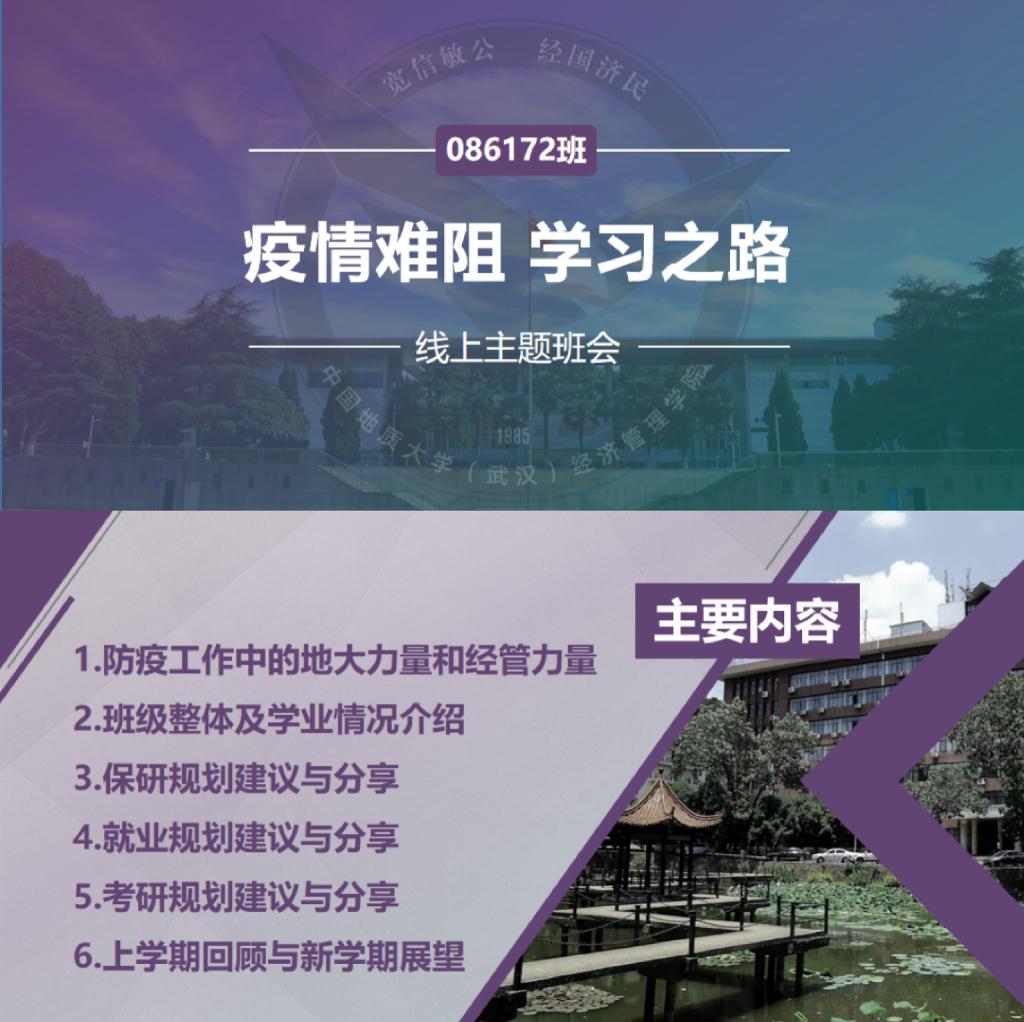 “在老师们和同学们的共同努力下,地大社区已经连续三天没有新增疑似和确诊病例,请同学们放心!”班会一开始,辅导员徐媛老师向同学们介绍了学校和学院抗“疫”工作的开展情况。在学校疫情防控工作小组的领导下,学校各个部门积极配合,抗“疫”工作有条不紊。校园消杀小分队、保卫小分队、封控应急工作队、党员应急突击队还有校园里的白衣天使们……工作人员和志愿者冲锋在前,守护着校园的安全净土。战“疫”中也注入了许多地大青年和经管青年的力量,我们的学生和校友们积极参加志愿服务、主动发起参与募捐,在各行各业发挥着自己应有的作用。