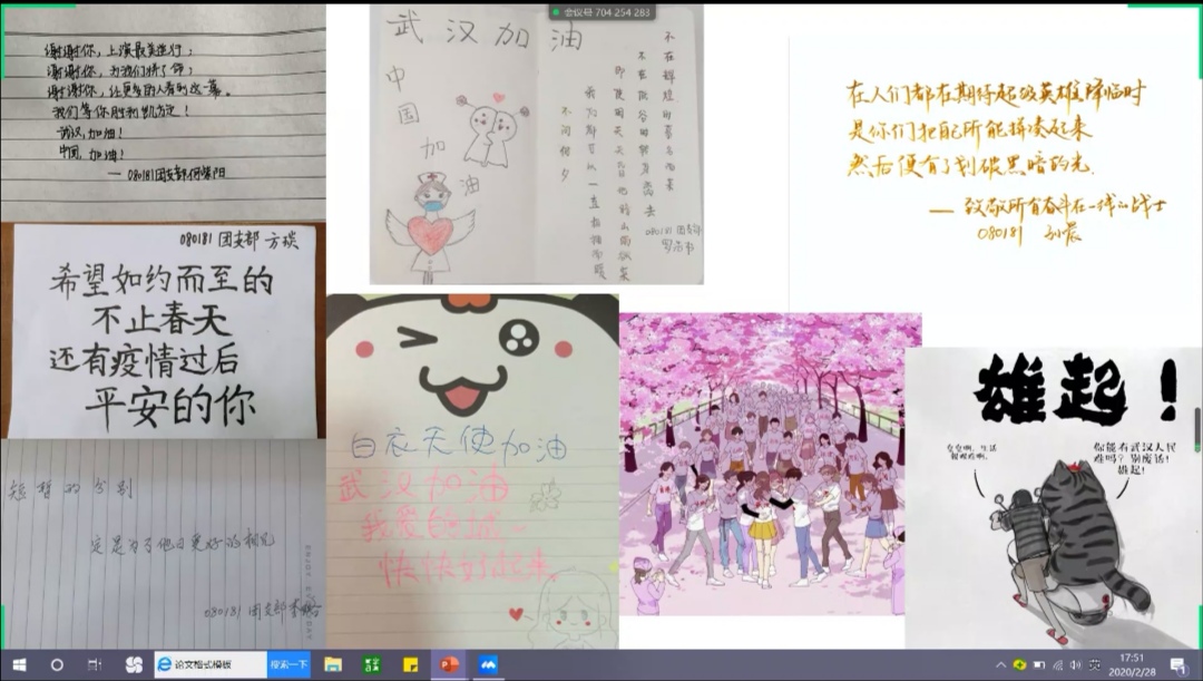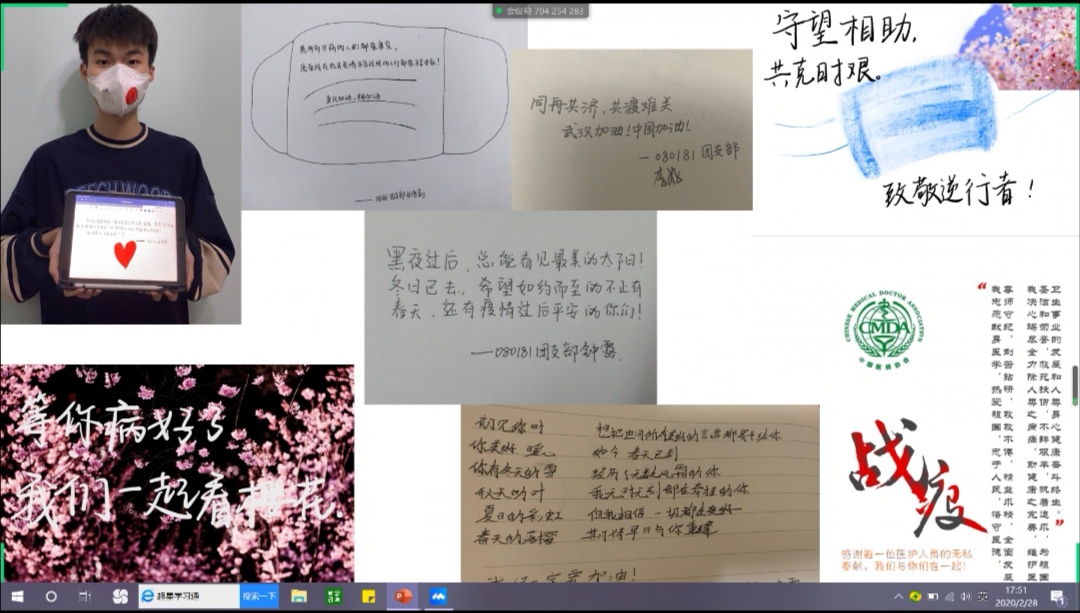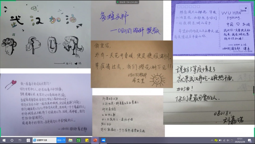 班会的最后,080181班同学们每人展示了自己的战“疫”祝福语,同时还在班级微信公众号上一起为武汉祈福。他们说:“爱与希望比病毒传播的更快,风雨压不跨,苦难中开花,多难兴邦,天耀中华,愿祖国平安昌盛,生生不息!”