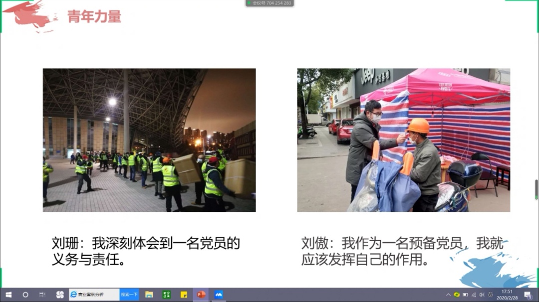班会中,团支书刘亚旭以我们身边的校园卫士、地大校友、青年榜样的鲜活典型为例,讲述了在疫情期间默默为人民付出的事迹,让同学们引起共鸣。听从党的召唤,风雨兼程到校医院工作的刘艳华;不知姓名为学校教学楼消毒的校园卫士;拥有24年党龄的地大校友,火神山、雷神山项目后勤保障内外部总协调负责人罗飞;还有为抗击疫情贡献自己的力量的志愿者同学们和可爱的班主任刘耕老师都是我们学习的榜样。他说“有党和国家的领导,有人民群众的众志成城,我们有理由相信在不久的将来疫情就能够的得到有效的控制。”来自武汉的余佳颖、方一楠同学对疫情感受最为真切。她们分别向大家分享了身在武汉的生活感受,以及讲述了受抗击疫情前线的妈妈的影响,在社区担任志愿者的故事。