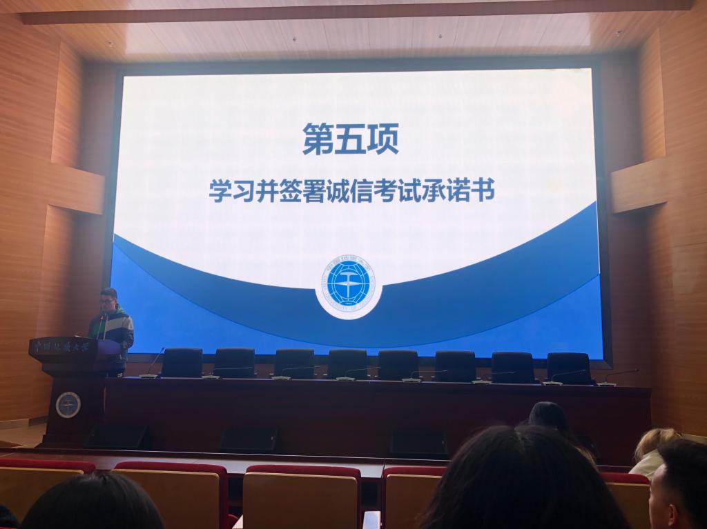 活动的第二项议题是考风考纪诚信教育。努尔老师首先带领同学们学习了《中华人民共和国刑法(修正案九)》中有关考试作弊的规定,呼吁同学们增强守法懂法意识。其次结合色色 《色色 (武汉)本科课程考核违规处理办法》宣读了违纪行为的认定与处理等相关规定,要求同学们诚信参加任何考试。紧接着,082182班黄浩同学作为学生代表,带领同学们学习《诚信考试承诺书》内容,全体同学签字承诺自觉遵守考核纪律。