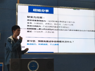 首先进行分享的是录取至厦门大学的祝靖涛。学长强调,做准备时要注意硬实力与软实力的双重强化。硬实力主要指专业课成绩、英语成绩、科研竞赛等,软实力指要有强大的信息收集整理能力、流利的英语口语和较为熟练的文书写作能力。学长还介绍了入营后老师们的关注点以及注意事项,给立志保研的同学们带来了很大的帮助。