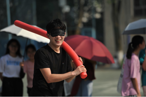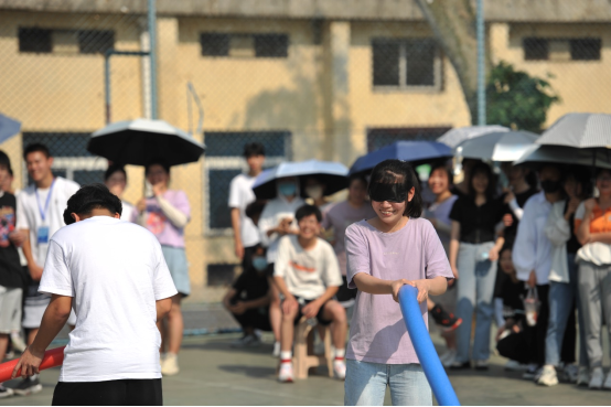 第四项:蒙眼互打。这个项目人气爆棚,活动现场瞬间成了武林高手过招现场,听声辩位,左突右刺,围观的同学们不时爆发出一阵阵笑声。