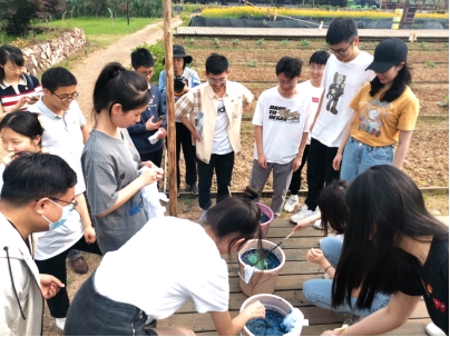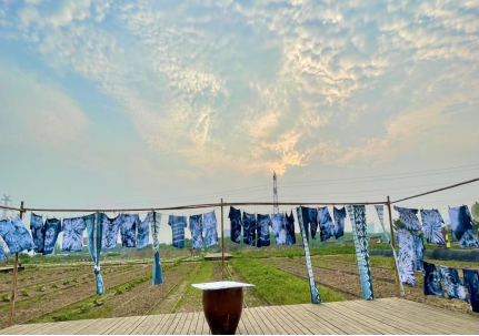 第一项活动是非物质文化遗产--扎染制作。扎染制作的重点在“扎”,由劳动实践基地工作人员为大家提前准备好了白色T恤、植物染料和橡皮筋等材料,再由专业老师讲解扎染手艺的原理后,展示了多种不同的扎染方式,同时鼓励同学们发散思维,积极探索更多的捆扎方式。老师和同学们纷纷尝试,在艺术细胞的碰撞后呈现出多样的作品。蓝天与田野相接,不同风格、不同样式的蓝色扎染T恤随风飘动,既增添了色彩,也赋上了更多生机。扎染体验充分展现出中华优秀传统文化魅力,也增添了本次实践行的乐趣。