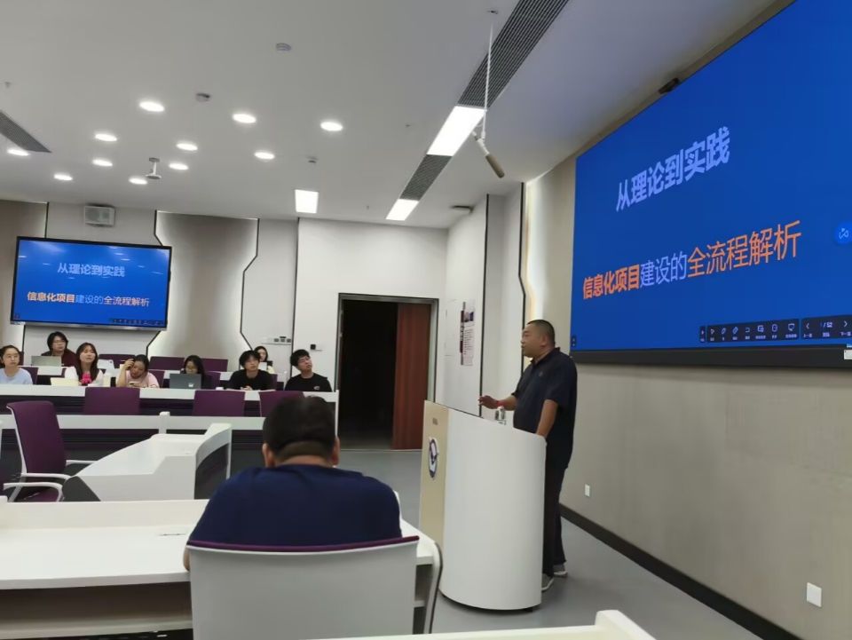 首先,王广民老师邀请了来自广州金鹏集团有限公司的王经理,给在场大三信管学生进行了《信息化项目建设的全流程解析》的专项报告,以政府部门信息化为例,分享了围绕政府部门信息化项目,从规划、实施到验收等阶段,详细阐述全流程中的要点、案例及对学生的启发。针对信管专业学生实习和就业痛点,重点拆解了信息化项目管理的流程,结合大量的真实案例和切身体验,为信管专业接下来的实习和求职工作提供了宝贵的实践素材和经验价值。