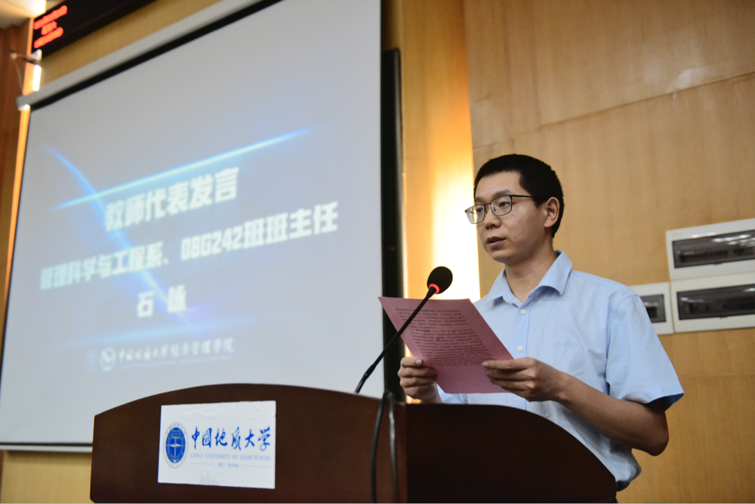 典礼第三项,教师代表、08G242班主任石咏老师发言。他以自身的四点体会,帮助同学们顺利度过大学时光:角色转换树目标、潜心笃志贵坚持、砥身砺行攀高峰、笑对人生迎挑战。最后,石老师希望同学们积极参与各项活动,树立远大理想,担当时代责任,成为德智体美劳全面发展的社会主义事业建设者和接班人。