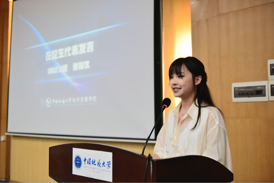 典礼第四项,在校生代表谢馨仪同学发言。她分享了自己三年的成长经验,从不敢设定目标到勇敢追梦,从竞赛到科研都取得了显著成绩,最终跨专业保研复旦大学。谢同学强调,敢于实践是关键,要克服恐惧,珍惜资源,逆向规划生涯。