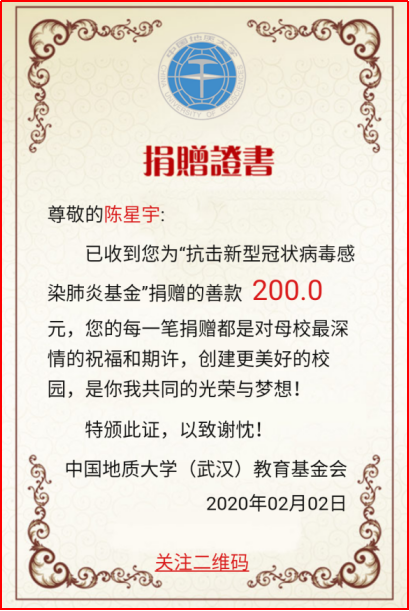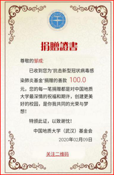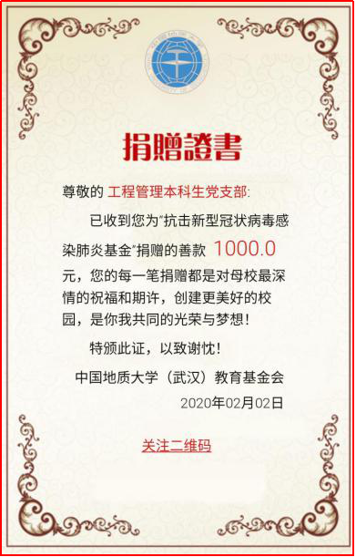 工程管理专业本科生党支部在这场防疫攻坚战中充分显示了其执行落实力和组织动员力。支部积极响应学校号召,落实学校党委的具体工作部署,利用党支部工作群,号召党员学习领会中共中央关于疫情防控的重要会议和决策部署;支部主动做好疫情防控的宣传工作,要求支部党员积极通过线上方式在班团中做好防疫宣传和学生心理疏导工作,“一个不少”针对支部所辖班团转发《致地大寒假留校学生的一封信》《致全体地大学子的一封信》《关于进一步加强学生留校及返校管理的通知》《关于开通心理支持网络服务的通知》《关于面向全校学生开通心理支持热线的通知》等重要文件。支部还号召党员力所能及地为重点疫区捐款捐物,支部内部募捐经费向地大教育发展基金会的“抗击新型肺炎基金”项目捐款1000元,以支部和党员个人名义向全国各地防疫相关基金会捐款共计3500余元。