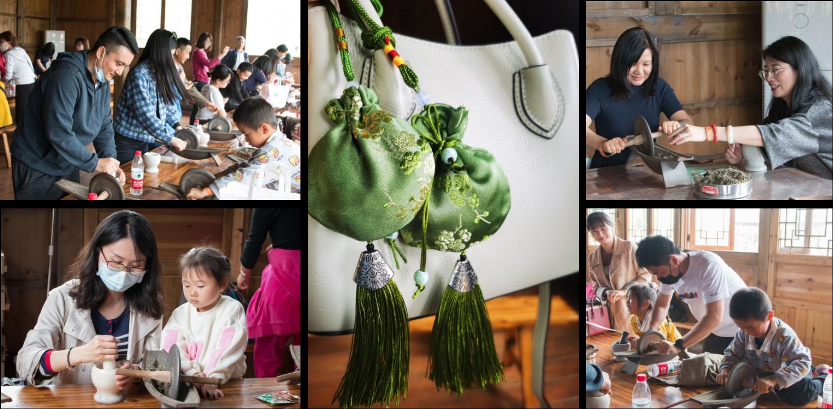 在基地手工指导老师的简明指导下,大家取一把艾叶,挑出碎梗和杂质,先在石臼里杵捣,再入铁碾中碾磨。你帮我拢拢材料,我帮你加点艾绒,父母耐心捣杵,孩子奋力碾磨。捣杵声声,磨碾嗡嗡,当艾叶在几番杵捣和碾磨中变得细软如棉,取出装袋入囊,一个气味芳香的艾绒香包就制成了。展在掌心,摇在手上,扣入纽扣,佩上背包,美在心里。