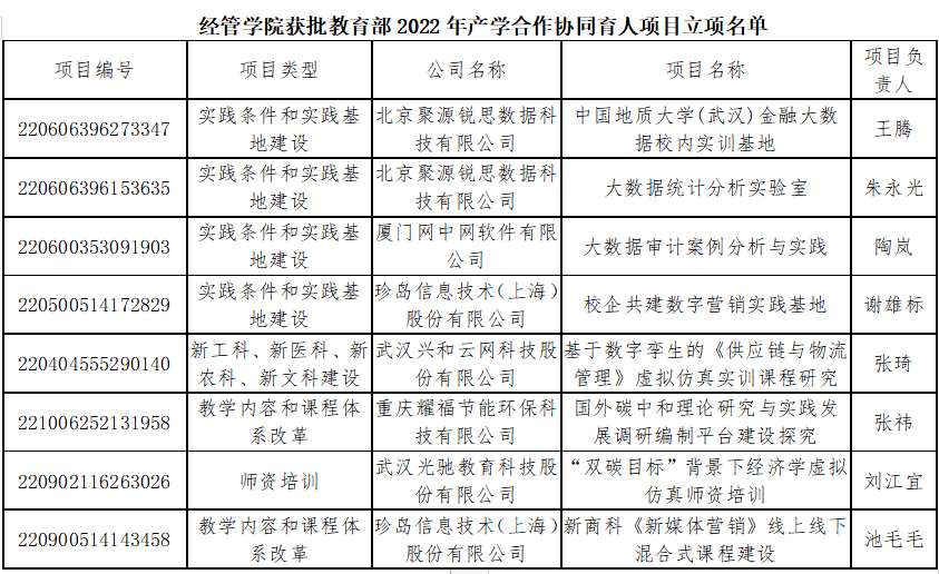近日,教育部高教司印发了《教育部高等教育司关于公布2022年产学合作协同育人项目立项名单的通知》,色色 46个项目获批立项,其中经管学院获批8项。